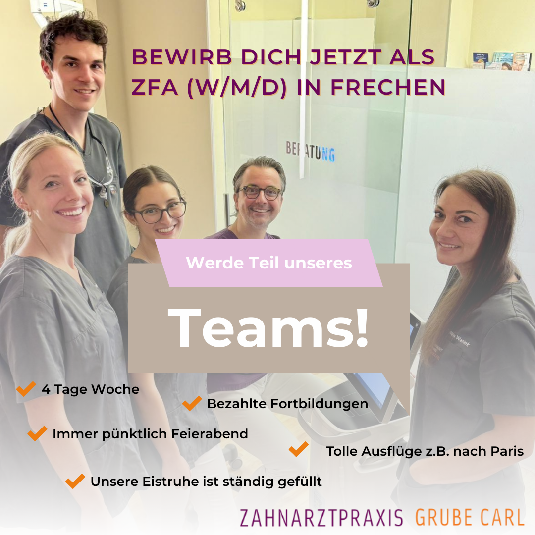 Wir suchen dich als Zahnmedizinische Fachangestellte (w/m/d) für unsere moderne Praxis in Frechen – ab Köln in ca. 30 Minuten mit der KVB Linie 7 erreichbar! 🚋